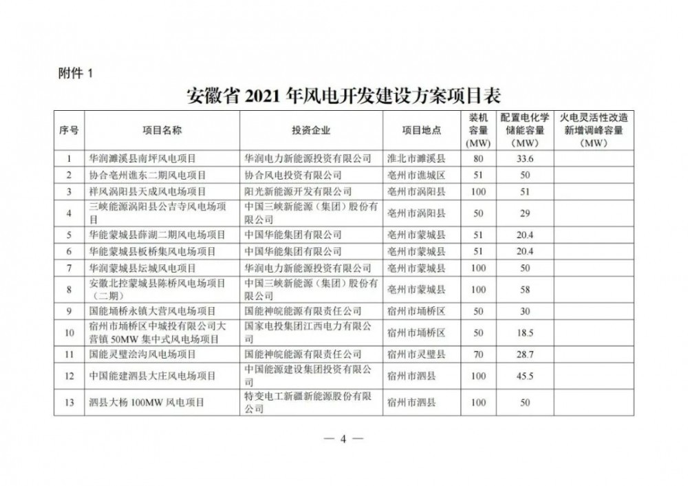 12月6日,安徽省能源局關于印發(fā)2021年風電、光伏發(fā)電開發(fā)建設方案的通知。其中,光伏并網(wǎng)容量4574MW,要求配置電化學儲能容量961.5 MW,火電靈活性改造新增調峰容量619.6MW。風電裝機容量1426MW,要求配置電化學儲能容量600.4 MW,火電靈活性改造新增調峰容量349.7MW。且規(guī)定電化學儲能電站連續(xù)儲能時長為1小時。