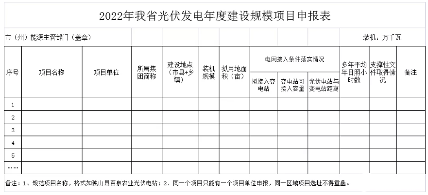 為積極貫徹落實國家“碳達峰、碳中和”工作目標,實現(xiàn)我省能源產業(yè)轉型、高質量發(fā)展,有序推進新能源項目建設,根據(jù)《貴州省風電光伏發(fā)電項目管理暫行辦法》,現(xiàn)開展我省2022年風電光伏發(fā)電年度建設規(guī)模項目申報工作,有關事項通知如下: