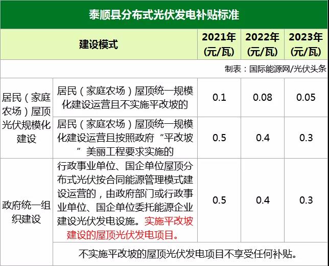 居民(家庭農場)屋頂光伏規(guī)?;ㄔO。居民(家庭農場)屋頂統(tǒng)一規(guī)模化建設運營且不實施平改坡的,在光伏發(fā)電項目建成、并網和驗收后給予居民發(fā)放一次性建設補貼。2021年、2022年、2023年建成、并網和驗收的實行差異化補貼,補貼標準分別為0.1元/瓦、0.08元/瓦、0.05元/瓦;