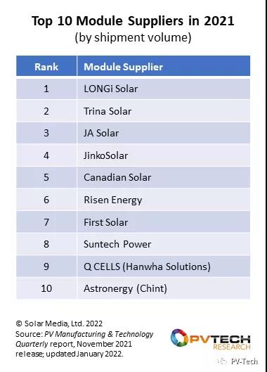 2021年,前10名的出貨總量接近150GW。如果有人仍認(rèn)為整個行業(yè)的規(guī)模在140-160GW的話(就像最近第三方機(jī)構(gòu)的許多錯誤預(yù)測值告訴我們的那樣),那么請?jiān)倏紤]一下。