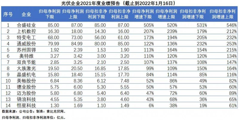 根據(jù)上交所和深交所的規(guī)定,上市企業(yè)上一年的年度經(jīng)營(yíng)業(yè)績(jī)同比增長(zhǎng)或下降超過(guò)50%,需要在當(dāng)年的1月31日前發(fā)布業(yè)績(jī)預(yù)告。在光伏企業(yè)2021年前三季度經(jīng)營(yíng)業(yè)績(jī)集體大漲的背景下,相信在接下來(lái)不到半個(gè)月的時(shí)間里,還會(huì)有更多的光伏企業(yè)披露業(yè)績(jī)預(yù)告。