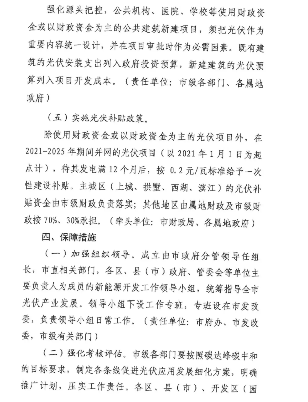 文件提到:除使用財政資金或以財政資金為主的光伏項目外,在2021-2025年期間并網(wǎng)的光伏項目(以2021年1月1日為起點計),待其發(fā)電滿12個月后,按0.2元/瓦標(biāo)準(zhǔn)給予一次性建設(shè)補(bǔ)貼。主城區(qū)(上城、拱墅、西湖、濱江)的光伏補(bǔ)貼資金由市級財政負(fù)責(zé)落實;其他地區(qū)由屬地財政及市級財政按70%、30%承擔(dān)。(牽頭單位:市財政局、各屬地政府)