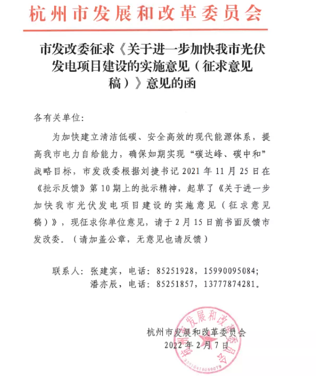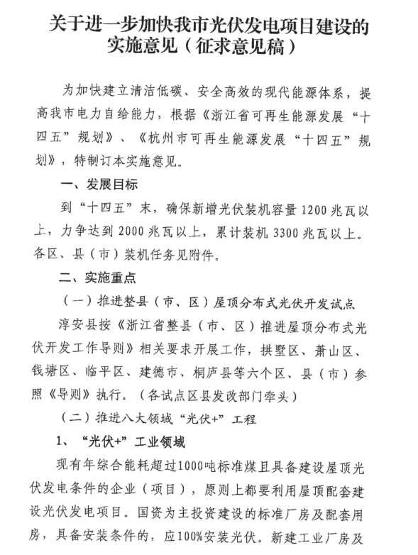 近日,杭州市發(fā)改委發(fā)布了一則關(guān)于征求《關(guān)于進(jìn)一步加快我市光伏發(fā)電建設(shè)的實施意見(征求意見稿)》意見的函。