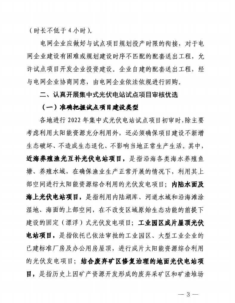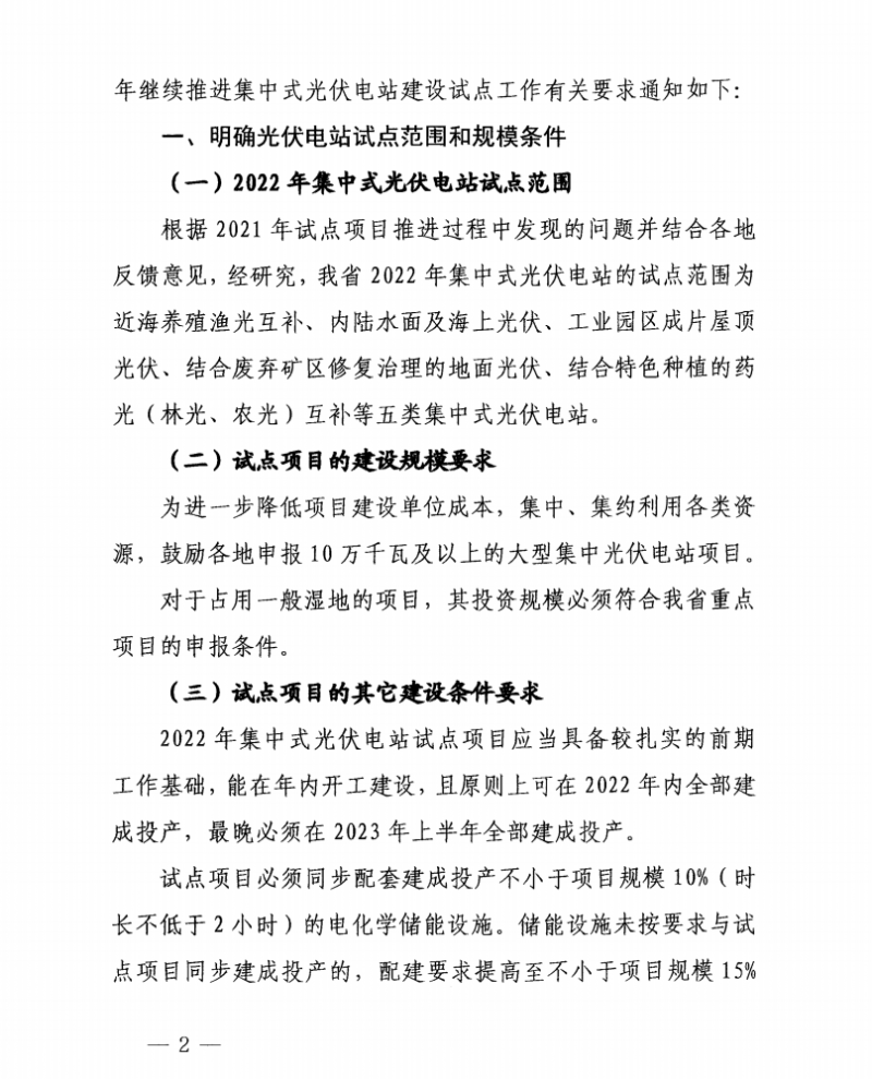 對(duì)2022年集中式光伏電站試點(diǎn)項(xiàng)目提出能在年內(nèi)開工建設(shè),且原則上可在2022年內(nèi)全部建成投產(chǎn),最晚必須在2023年上半年全部建成投產(chǎn)的建設(shè)要求。并要求試點(diǎn)項(xiàng)目必須同步配套建成投產(chǎn)不小于項(xiàng)目規(guī)模10%(時(shí)長(zhǎng)不低于2小時(shí))的電化學(xué)儲(chǔ)能設(shè)施。儲(chǔ)能設(shè)施未按要求與試點(diǎn)項(xiàng)目同步建成投產(chǎn)的,配建要求提高至不小于項(xiàng)目規(guī)模15%(時(shí)長(zhǎng)不低于4小時(shí))。