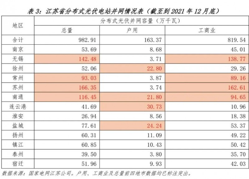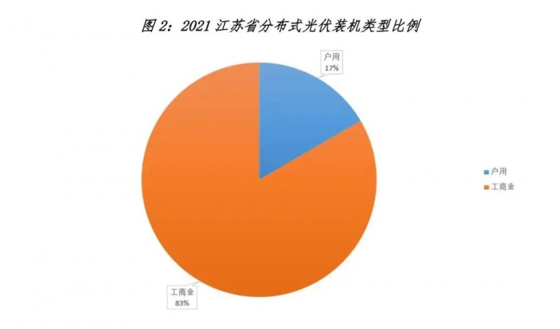 根據(jù)電網(wǎng)公司分布式光伏并網(wǎng)數(shù)據(jù),截止到 2021 年 12 月,江蘇分布式光伏累計(jì)并網(wǎng)規(guī)模為 982.91 萬千瓦,其中,累計(jì)戶用光伏并網(wǎng) 163.37 萬千瓦,約占比17%;累計(jì)工商業(yè)分布式光伏并網(wǎng) 819.54 萬千瓦,約占比 83%??梢?,江蘇分布式光伏市場(chǎng)以工商業(yè)分布式為絕對(duì)主導(dǎo)。