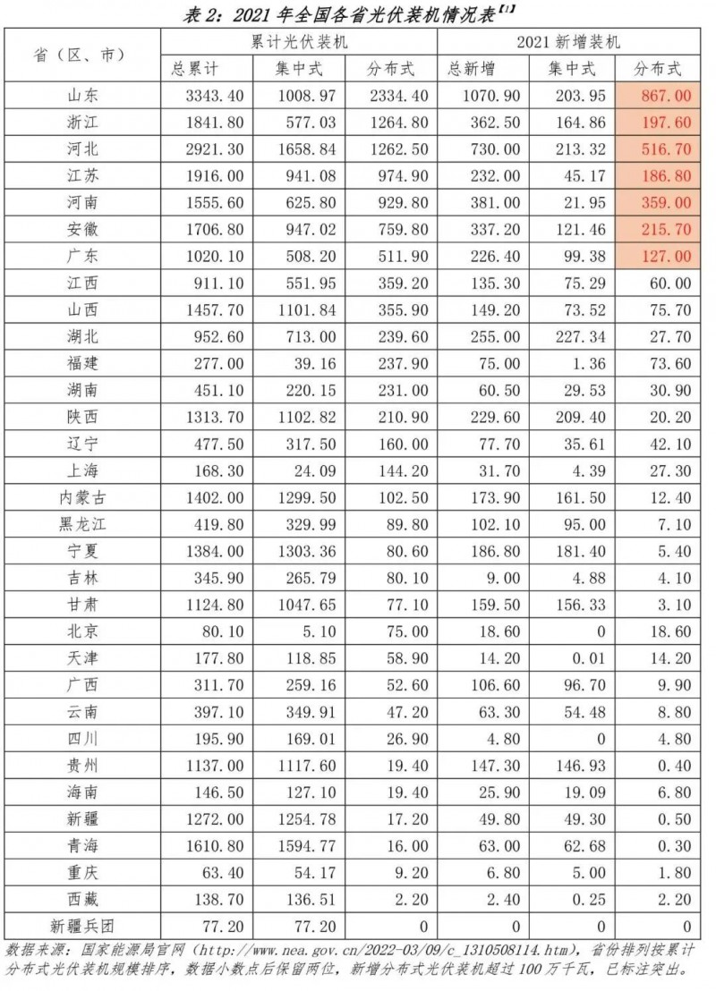根據(jù)國(guó)家能源局官方公布的數(shù)據(jù),截至 2021 年底,江蘇省累計(jì)光伏裝機(jī)規(guī)模為1916 萬千瓦,其中,集中式光伏電站 941.08 萬千瓦,占比 49.12%,分布式光伏裝機(jī)為 974.9 萬千瓦,占比 50.88%。