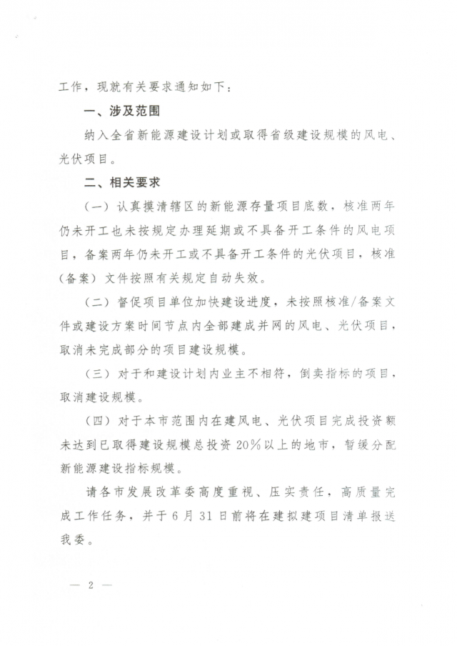 督促項目單位加快建設進度,未按照核準/備案文件或建設方案時間節(jié)點內(nèi)全部建成并網(wǎng)的風電、光伏項目,取消未完成部分的項目建設規(guī)模。