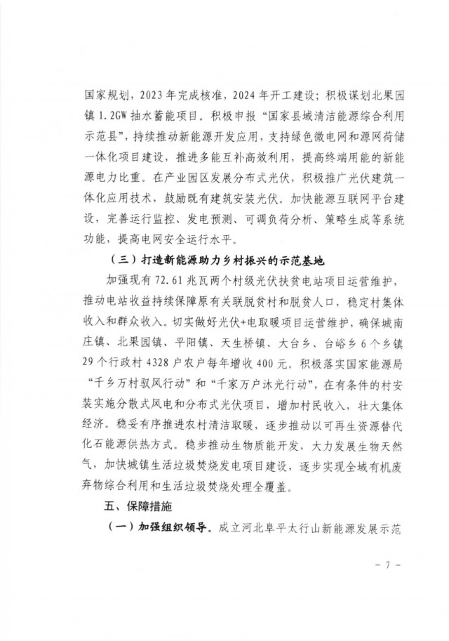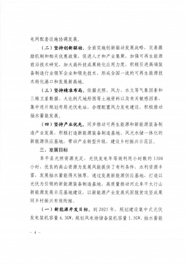 三、原則同意《河北阜平太行山新能源發(fā)展示范基地實施方案》提出的新能源開發(fā)目標,到2025年規(guī)劃建設集中式光伏6.3GW、風電1.5GW、抽水蓄能1.2GW,2030年在此基礎上進一步實現(xiàn)高質(zhì)量跨越式發(fā)展。