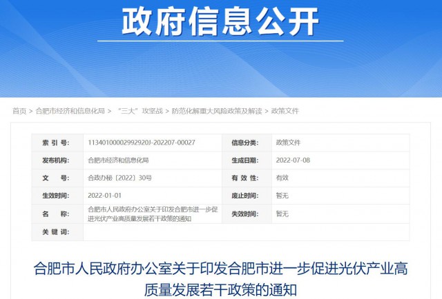 10月18日,合肥市經(jīng)濟和信息化局、合肥市財政局聯(lián)合發(fā)布“關于印發(fā)《合肥市進一步促進光伏產(chǎn)業(yè)高質量發(fā)展若干政策實施細則》的通知”。