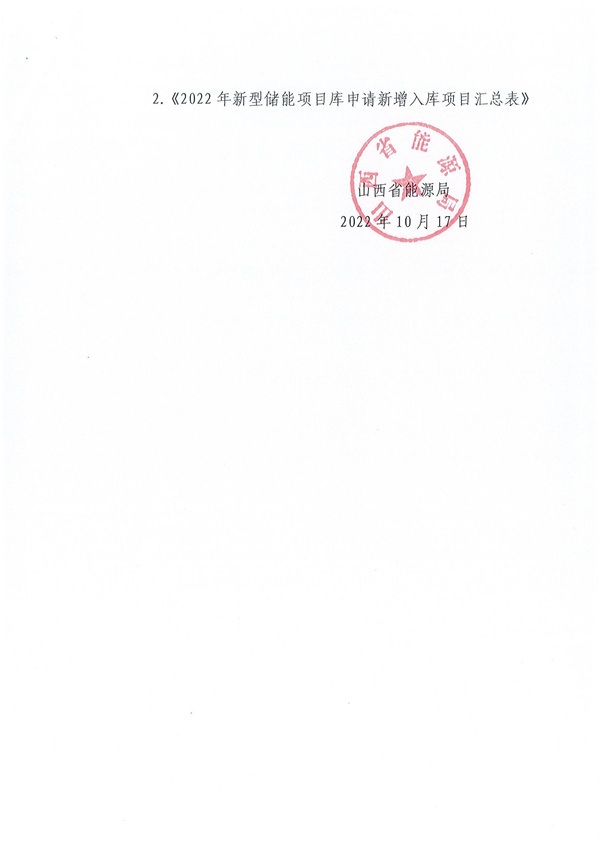 10月20日,山西省能源局發(fā)布關(guān)于組織建立和報(bào)送新型儲(chǔ)能省級(jí)規(guī)劃項(xiàng)目庫(kù)的通知,通知指出,入庫(kù)項(xiàng)目分為新能源場(chǎng)站配置新型儲(chǔ)能項(xiàng)目、電網(wǎng)側(cè)新型儲(chǔ)能項(xiàng)目、用戶側(cè)新型儲(chǔ)能項(xiàng)目、聯(lián)合火電調(diào)頻儲(chǔ)能試點(diǎn)項(xiàng)目等。