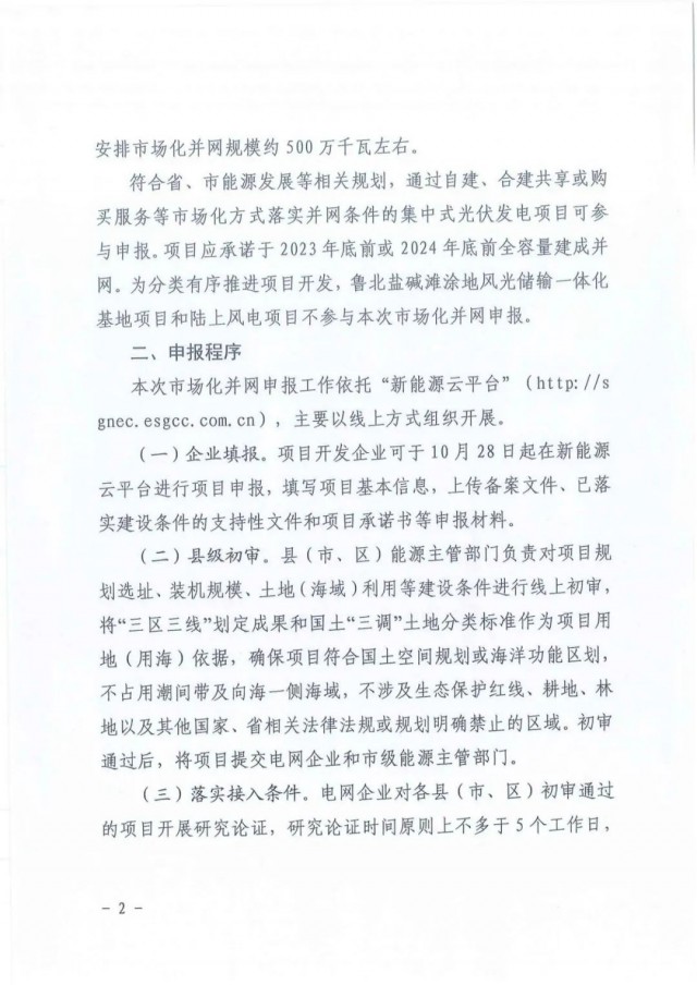 符合省、市能源發(fā)展等相關(guān)規(guī)劃,通過(guò)自建、合建共享或購(gòu)買(mǎi)服務(wù)等市場(chǎng)化方式落實(shí)并網(wǎng)條件的集中式光伏發(fā)電項(xiàng)目可參與申報(bào)。項(xiàng)目應(yīng)承諾于2023年底前或2024年底前全容量建成并網(wǎng)。為分類(lèi)有序推進(jìn)項(xiàng)目開(kāi)發(fā),魯北鹽堿灘涂地風(fēng)光儲(chǔ)輸一體化基地項(xiàng)目和陸上風(fēng)電項(xiàng)目不參與本次市場(chǎng)化并網(wǎng)申報(bào)。