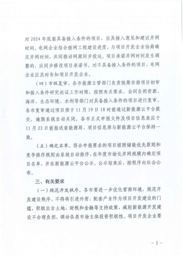 (四)市級(jí)復(fù)審。各市能源主管部門(mén)負(fù)責(zé)統(tǒng)籌安排項(xiàng)目初審和接入條件研究論證工作時(shí)限,按照有關(guān)要求,會(huì)同自然資源、海洋、生態(tài)環(huán)境、水利等部門(mén)對(duì)具備接入條件的項(xiàng)目進(jìn)行復(fù)審。各市復(fù)審?fù)ㄟ^(guò)項(xiàng)目須于11月19日18時(shí)前通過(guò)新能源云平臺(tái)提交,逾期系統(tǒng)自動(dòng)關(guān)閉。各市正式申報(bào)文件及項(xiàng)目信息表應(yīng)于11月22日前報(bào)送省能源局,項(xiàng)目信息須與新能源云平臺(tái)保持一致。