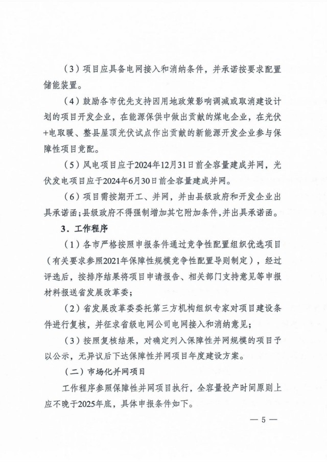 5)保障性規(guī)模項目:風(fēng)電項目應(yīng)于2024年12月31日前全容量建成并網(wǎng),光伏發(fā)電項目應(yīng)于2024年6月30日前全容量建成并網(wǎng)。