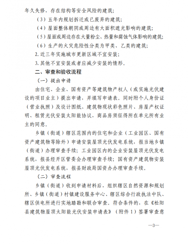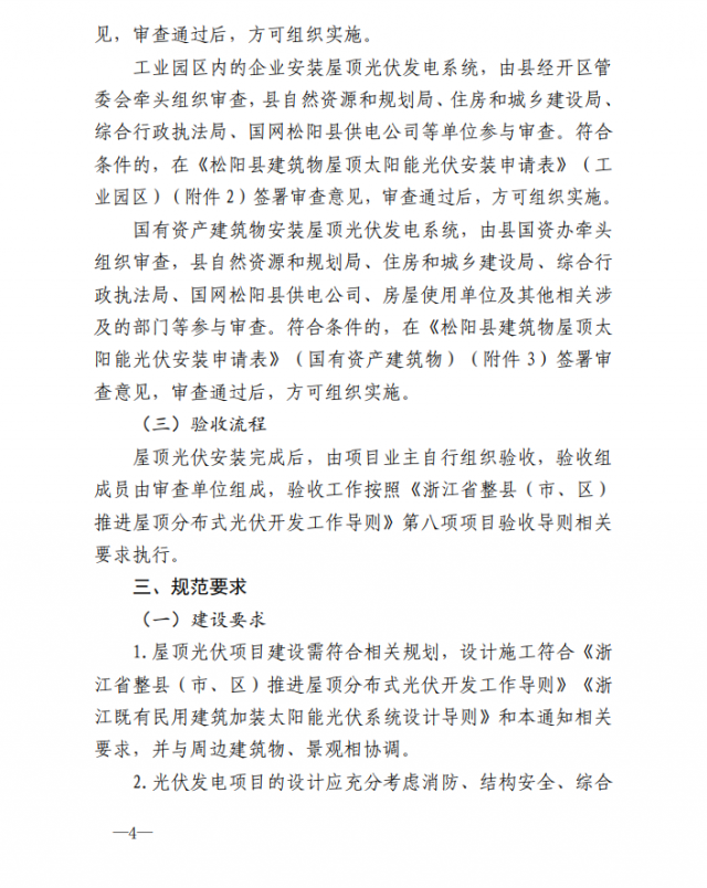 2、審查和驗收流程:建筑產(chǎn)權(quán)人或光伏項目業(yè)主提出申請,填寫《松陽縣建筑物屋頂太陽能光伏安裝申請表》并附相關(guān)申請資料,按照所屬區(qū)塊報屬地鄉(xiāng)鎮(zhèn)街道或縣經(jīng)開區(qū)管委會牽頭組織審查,國有資產(chǎn)屋頂建設(shè)光伏項目報縣財政局國資辦組織審查。自然資源和規(guī)劃局、住房和城鄉(xiāng)建設(shè)局、綜合新增執(zhí)法局、國網(wǎng)松陽縣供電公司等相關(guān)部門或其下屬派出機構(gòu)參與審查。符合條件的,各審查單位在申請表中簽署審查意見,方可組織實施。建設(shè)完成后,項目業(yè)主自主驗收,審查單位參與驗收,驗收工作按照《浙江省整縣(市、區(qū))推進屋頂分布式光伏開發(fā)工作導則》第八項項目驗收導則相關(guān)要求執(zhí)行。