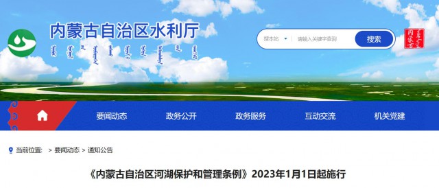 2022年11月23日,內(nèi)蒙古自治區(qū)第十三屆人民代表大會常務(wù)委員會第三十八次會議通過《內(nèi)蒙古自治區(qū)河湖保護(hù)和管理條例》,現(xiàn)予公布,自2023年1月1日起施行。