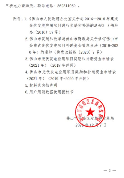 12月8日,廣東省佛山市南海區(qū)發(fā)改局發(fā)布《關(guān)于組織申報(bào)2021年度光伏應(yīng)用項(xiàng)目獎(jiǎng)勵(lì)和補(bǔ)助資金的通知》,2021年度光伏應(yīng)用項(xiàng)目獎(jiǎng)勵(lì)和補(bǔ)助資金申報(bào)將在佛山扶持通平臺(tái)上開展,請(qǐng)2018-2020年度建成并網(wǎng)的用戶根據(jù)本通知準(zhǔn)備相關(guān)材料,到佛山扶持通平臺(tái)上進(jìn)行申報(bào)。