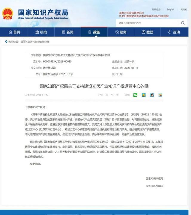 1月30日,國家知識產(chǎn)權(quán)局發(fā)布《關(guān)于支持建設(shè)光伏產(chǎn)業(yè)知識產(chǎn)權(quán)運(yùn)營中心的函》,明確支持北京晶澳太陽能光伏科技有限公司(以下簡稱“晶澳科技”)建設(shè)“光伏產(chǎn)業(yè)知識產(chǎn)權(quán)運(yùn)營中心”。這是光伏制造領(lǐng)域(不含多晶硅)首個(gè)國家級知識產(chǎn)權(quán)運(yùn)營中心,體現(xiàn)了國家對晶澳科技在光伏制造領(lǐng)域科技實(shí)力和知識產(chǎn)權(quán)運(yùn)作能力的肯定。
