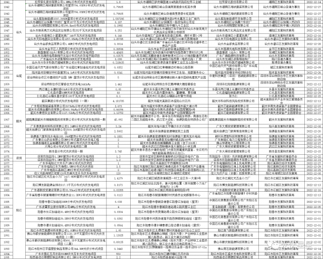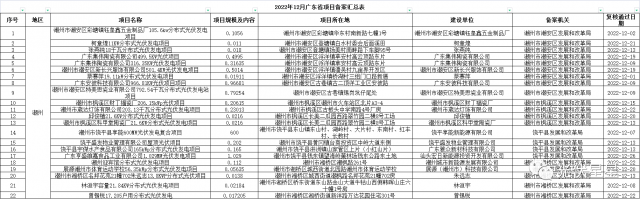據(jù)廣東省投資備案平臺(tái)上統(tǒng)計(jì),2022年12月廣東省光伏項(xiàng)目備案1381個(gè),總?cè)萘考s5.3GW。其中地面光伏項(xiàng)目19個(gè),總?cè)萘繛?720MW,其中湛江占5個(gè),總?cè)萘?220MW,陽(yáng)江、清遠(yuǎn)、潮州皆超600MW,最大容量地面光伏項(xiàng)目為潮州項(xiàng)目600MW。