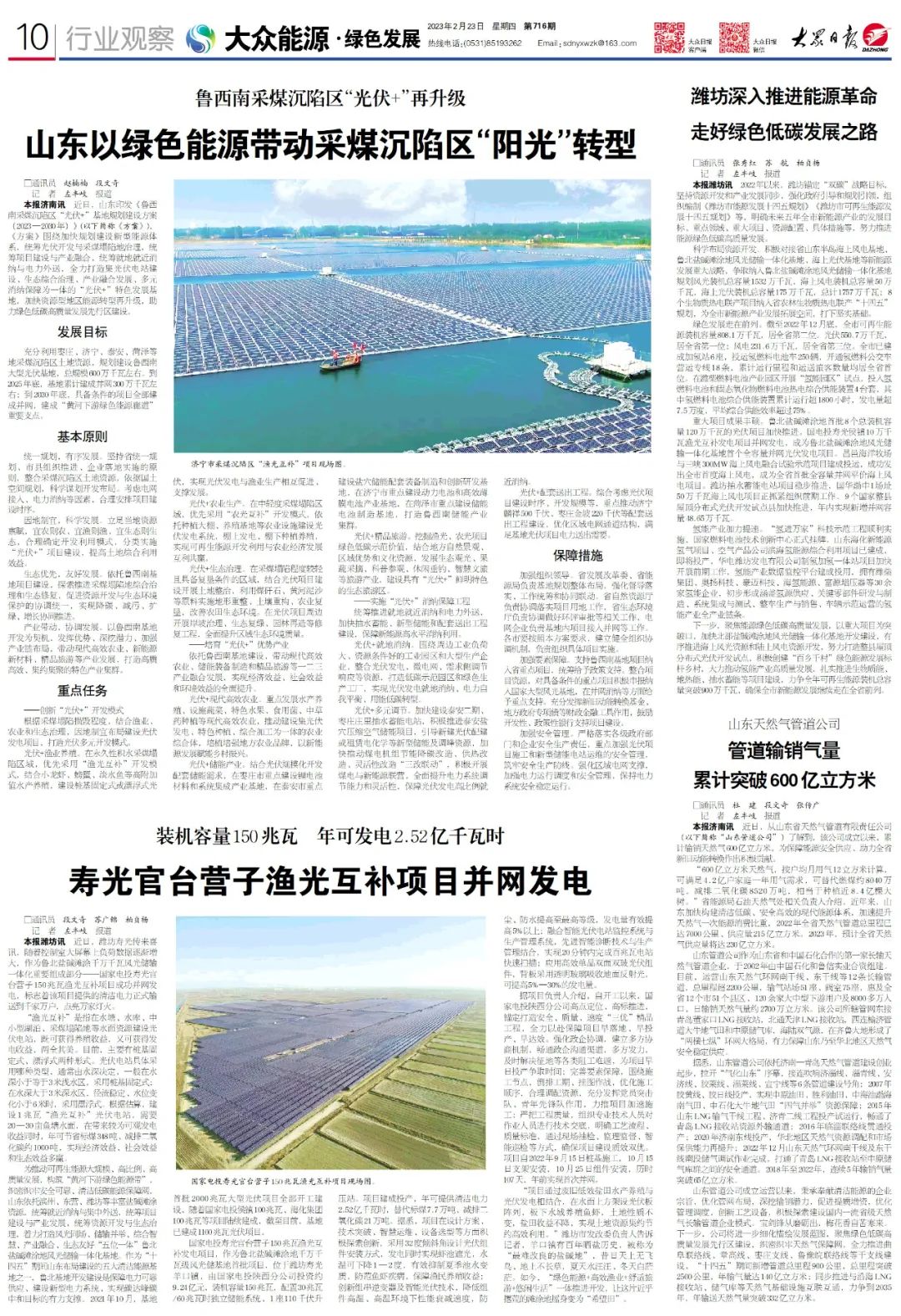 近日,山東印發(fā)《魯西南采煤沉陷區(qū)“光伏+”基地規(guī)劃建設(shè)方案(2023—2030年)》(以下簡(jiǎn)稱《方案》),《方案》圍繞加快規(guī)劃建設(shè)新型能源體系,統(tǒng)籌光伏開發(fā)與采煤塌陷地治理,統(tǒng)籌項(xiàng)目建設(shè)與產(chǎn)業(yè)融合,統(tǒng)籌就地就近消納與電力外送,全力打造集光伏電站建設(shè)、生態(tài)綜合治理、產(chǎn)業(yè)融合發(fā)展、多元消納保障為一體的“光伏+”特色發(fā)展基地,加快資源型地區(qū)能源轉(zhuǎn)型再升級(jí),助力綠色低碳高質(zhì)量發(fā)展先行區(qū)建設(shè)。