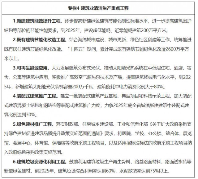 14.全面推行綠色施工。加快推進建筑工業(yè)化,大力發(fā)展裝配式建筑,推廣鋼結(jié)構(gòu)住宅,開展裝配式裝修試點。提高預(yù)制構(gòu)件和部品部件通用性,推廣標(biāo)準(zhǔn)化、少規(guī)格、多組合設(shè)計。推廣應(yīng)用綠色建材,鼓勵政府采購工程項目優(yōu)先選用獲得綠色建材認證標(biāo)識的建材產(chǎn)品。農(nóng)房建設(shè)鼓勵就地取材和利用鄉(xiāng)土材料。發(fā)展建筑產(chǎn)業(yè)互聯(lián)網(wǎng),實現(xiàn)建筑材料數(shù)字化管理,促進合理安排材料采購,減少材料損耗和運輸距離。推動施工現(xiàn)場優(yōu)先使用節(jié)能燈具和節(jié)電型施工機械,對多臺同類設(shè)備實施群控技術(shù),監(jiān)控重點能耗設(shè)備耗能,探索施工用能限額。加強對施工現(xiàn)場的管理,將房屋建筑和市政工程施工工地噪聲、揚塵、污水、建筑垃圾等納入建筑業(yè)清潔生產(chǎn)管理范疇,推動建設(shè)一批建筑領(lǐng)域清潔生產(chǎn)企業(yè)。