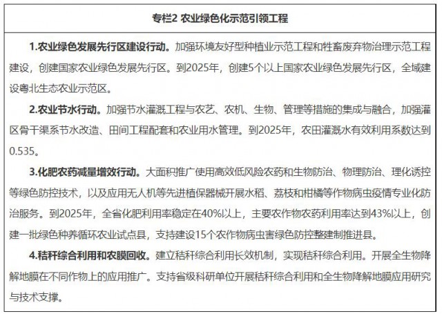5.推廣農(nóng)業(yè)清潔生產(chǎn)新模式。落實百縣千鎮(zhèn)萬村高質(zhì)量發(fā)展各項要求,加快推進農(nóng)業(yè)清潔生產(chǎn)。加快構(gòu)建種植業(yè)、畜禽養(yǎng)殖業(yè)、水產(chǎn)養(yǎng)殖業(yè)清潔生產(chǎn)技術(shù)體系,實施糧經(jīng)飼統(tǒng)籌、種養(yǎng)加結(jié)合、農(nóng)林牧漁融合發(fā)展等一體化發(fā)展模式。支持我省預(yù)制菜產(chǎn)業(yè)高質(zhì)量發(fā)展。大力發(fā)展綠色低碳循環(huán)農(nóng)業(yè),推進農(nóng)光互補、“光伏+設(shè)施農(nóng)業(yè)”、“海上風(fēng)電+海洋牧場”等低碳農(nóng)業(yè)模式。增加農(nóng)村清潔能源供應(yīng),推動農(nóng)村生物質(zhì)能綜合利用。發(fā)展林業(yè)循環(huán)經(jīng)濟,培育林業(yè)龍頭企業(yè),建設(shè)林草中藥材、油茶、竹等具有廣東特色的林業(yè)產(chǎn)業(yè)發(fā)展基地,積極創(chuàng)建國家現(xiàn)代林業(yè)產(chǎn)業(yè)示范園區(qū),實施森林生態(tài)標(biāo)志產(chǎn)品建設(shè)工程。以現(xiàn)代農(nóng)業(yè)產(chǎn)業(yè)園、農(nóng)林業(yè)龍頭企業(yè)等為重點,深入推行農(nóng)業(yè)清潔生產(chǎn),形成一批可推廣、可復(fù)制的典型案例。