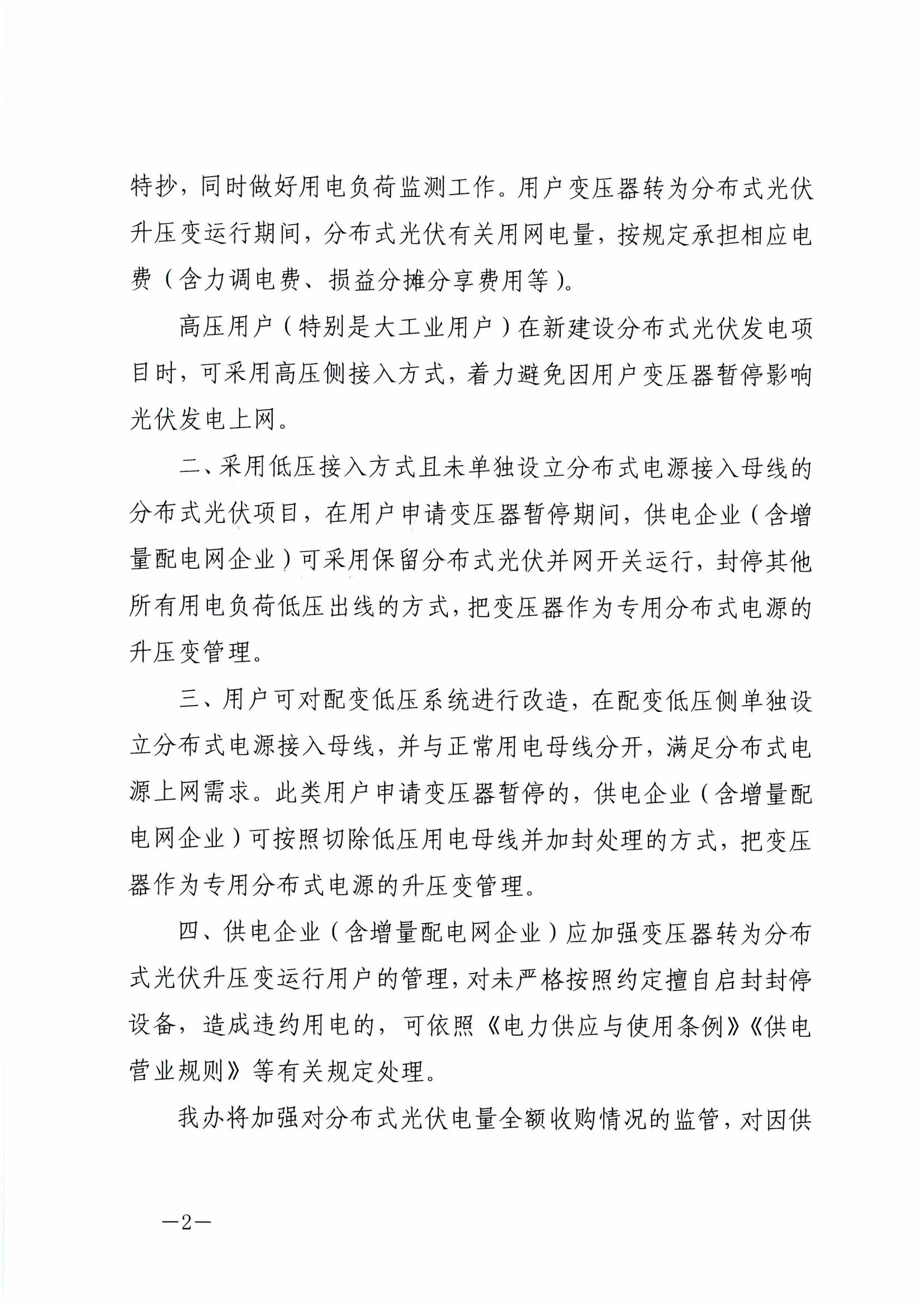 二、采用低壓接入方式且未單獨設(shè)立分布式電源接入母線的分布式光伏項目,在用戶申請變壓器暫停期間,供電企業(yè)(含增量配電網(wǎng)企業(yè))可采用保留分布式光伏并網(wǎng)開關(guān)運行,封停其他所有用電負(fù)荷低壓出線的方式,把變壓器作為專用分布式電源的升壓變管理。