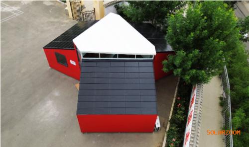 值得一提的是,此次“方寸空間微型幼兒園”為適應(yīng)溫帶半干旱氣候地區(qū)環(huán)境,設(shè)計聚落型房屋,三個單坡頂圍合中庭,外圍空間布局幼兒教學(xué)及活動空間,中間高聳采光空間成為舞臺,三個房屋之間設(shè)計通高玻璃隔斷,其中南面成為主入口,而另外兩個方向作為通風(fēng)口,中庭不僅作為幼兒很好的展示游樂場所,也可減少白天刺眼陽光與熱量。房屋四面減少窗戶以增強保溫隔熱,中庭設(shè)計高窗及垂直條形開口,作為主要采光通風(fēng),天氣好時可將門打開,提供良好通風(fēng)。“方寸空間微型幼兒園”做到了在陽光明媚的日子里,光伏瓦屋面提供室內(nèi)外所有的電力需求,用不完的電能自動進入儲能電池供應(yīng)陰雨天和夜間照明及電器用電。“方寸空間微型幼兒園”屋面采用可完全替代傳統(tǒng)瓦片的光伏瓦片,既解決以前光伏板左右搭接處滲漏隱患,又保證光伏瓦片搭接處平整,為學(xué)生們提供更好的學(xué)習(xí)環(huán)境。學(xué)校還可以把用不完的電賣給國家電網(wǎng),收入可用于進一步改善學(xué)校的環(huán)境。
