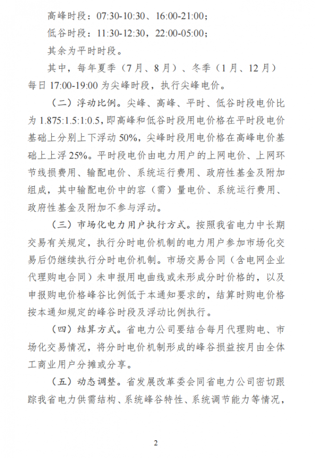 浮動比例。尖峰、高峰、平時、低谷時段電價比為1.875:1.5:1:0.5,即高峰和低谷時段用電價格在平時段電價基礎(chǔ)上分別上下浮動50%,尖峰時段用電價格在高峰電價基礎(chǔ)上上浮25%。平時段電價由電力用戶的上網(wǎng)電價、上網(wǎng)環(huán)節(jié)線損費用、輸配電價、系統(tǒng)運(yùn)行費用、政府性基金及附加組成,其中輸配電價中的容(需)量電價、系統(tǒng)運(yùn)行費用、政府性基金及附加不參與浮動。