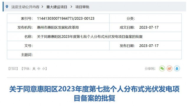 你單位報(bào)來《關(guān)于惠陽區(qū)2023年度第七批個(gè)人分布式光伏發(fā)電項(xiàng)目申請備案的請示》(惠陽供電〔2023〕90號)收悉。經(jīng)研究,現(xiàn)就項(xiàng)目備案事項(xiàng)批復(fù)如下: