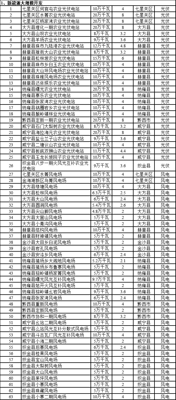 總體來看, 畢節(jié)綜合能源基地規(guī)劃了17.2GW的新能源項目,涉及光伏4.6GW,風電4.17GW,國家電投新能源基地8.37GW。