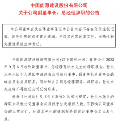 2023年9月6日,中國能建公告,孫洪水辭職,將不再擔(dān)任公司任何職務(wù)。