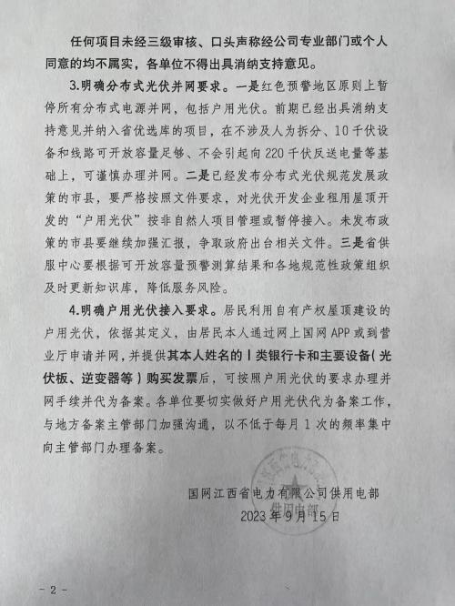 日前,國網(wǎng)江西省下發(fā)《關于進一步明確分布式光伏消納和并網(wǎng)服務有關事項的通知》,明確要求紅色預警地區(qū)暫停戶用光伏并網(wǎng),企業(yè)租用屋頂開發(fā)的戶用光伏按非自然人管理或暫停接入,任何項目未經(jīng)三級審核均不得出具消納意見。