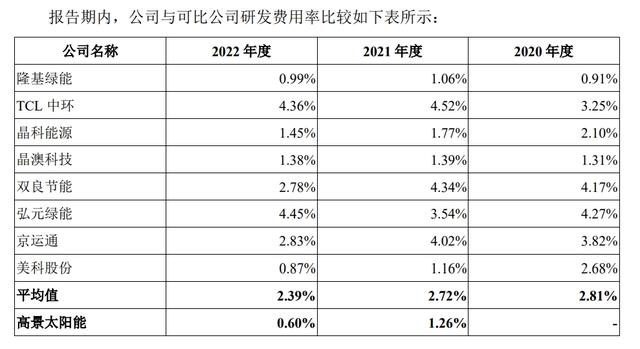但高景太陽能與同行相比,研發(fā)投入占營(yíng)收比例較低。招股書數(shù)據(jù)顯示,2020年,高景太陽能未發(fā)生研發(fā)費(fèi)用。2021-2022年,高景太陽能研發(fā)費(fèi)用分別約3143.15萬元、1.06億元,占當(dāng)期營(yíng)收比重僅為1.26%和0.6%。作為光伏產(chǎn)業(yè)鏈企業(yè),研發(fā)費(fèi)用過低或?qū)⒂绊懝竞罄m(xù)經(jīng)營(yíng)潛力。