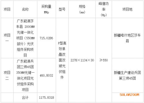 本次組件采購包括廣東能源莎車縣2000MW光儲一體化項目(550MW部分)光伏組件采購項目、廣東能源兵團三師45團350MW光儲一體化項目光伏組件采購項目的單晶雙面雙玻太陽能光伏組件及配套組串引出線用接插件、備品備件、專用工具和技術服務,具體數量及要求如下: