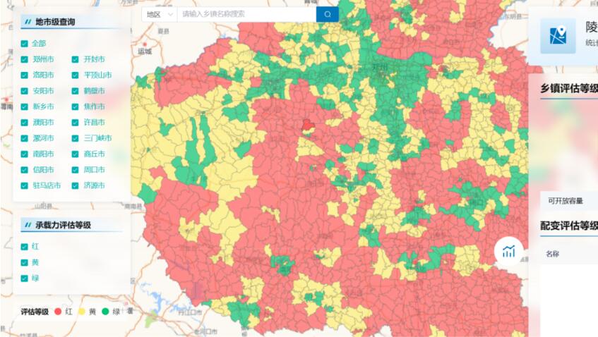 根據(jù)全省的分布地圖來看,河南省內(nèi)大部分區(qū)域承載力評估等級為紅色,黃色區(qū)域則明顯多于綠色區(qū)域。根據(jù)平臺提示來看,優(yōu)先支持在綠色地區(qū)開發(fā)建設(shè)分布式光伏項目,對于黃色區(qū)域的項目應(yīng)開展專項分析后再行開發(fā)建設(shè),紅色配變已超過熱穩(wěn)定極限,無法接入分布式光伏。