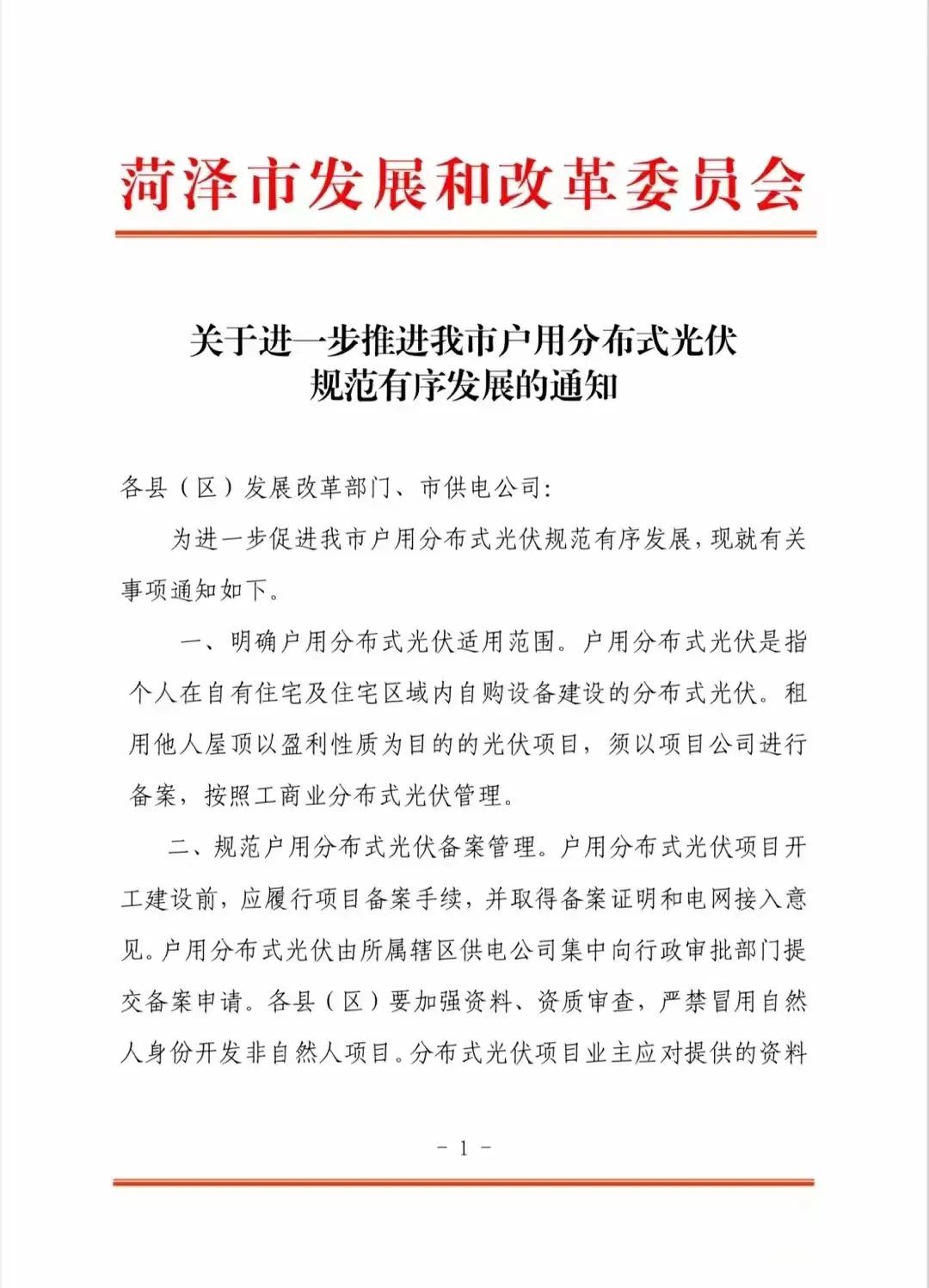 山東菏澤市發(fā)展和改革委員會下《發(fā)關于進一步推進我市戶用分布式光伏規(guī)范有序發(fā)展的通知》。