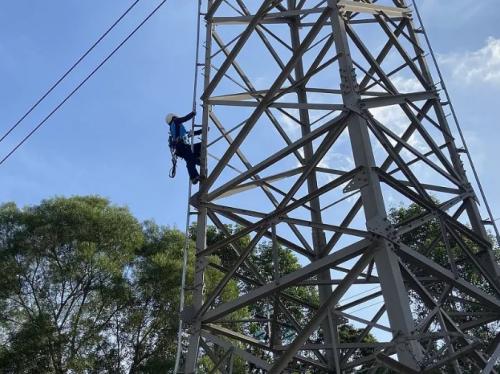 ▲香港中電集團(tuán)員工攀爬鐵塔進(jìn)行高空作業(yè)