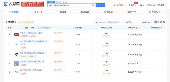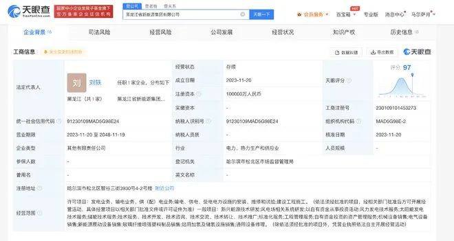 天眼查App顯示,11月20日,黑龍江省新能源集團(tuán)有限公司成立,法定代表人為劉軼,注冊資本10億人民幣,經(jīng)營范圍含新興能源技術(shù)研發(fā)、風(fēng)電場相關(guān)系統(tǒng)研發(fā)、以自有資金從事投資活動、風(fēng)力發(fā)電技術(shù)服務(wù)、太陽能發(fā)電技術(shù)服務(wù)、儲能技術(shù)服務(wù)、工程管理服務(wù)等。股東信息顯示,該公司由中國一重(601106)、佳電股份(000922)、黑龍江辰能清潔能源有限公司、上海電氣新能源發(fā)展有限公司、北京天潤新能投資有限公司共同持股。