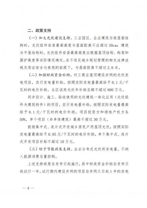 政策方面,文件指出,對工商業(yè)屋頂建設(shè)并網(wǎng)的光伏發(fā)電項(xiàng)目,實(shí)行發(fā)電量補(bǔ)助,按照實(shí)際發(fā)電量最高給予0.1元/千瓦時的電價補(bǔ)助。全區(qū)該類光伏年補(bǔ)助總額不超過800萬元。同步設(shè)計、施工、驗(yàn)收使用的光伏建筑一體化應(yīng)用(光伏組件為建筑構(gòu)件)的項(xiàng)目,實(shí)行發(fā)電量補(bǔ)助,按照實(shí)際發(fā)電量最高給予0.1元/千瓦時的電價補(bǔ)助,項(xiàng)目投資方和場地產(chǎn)權(quán)方各50%,單個項(xiàng)目(非單體建筑)最高不超過30萬元。鼓勵集中式、連片式開發(fā)城鄉(xiāng)居民戶用屋頂光伏,按照實(shí)際發(fā)電量最高給予0.05元/千瓦時的電價補(bǔ)助,單個集中式、連片式開發(fā)項(xiàng)目補(bǔ)貼不超過10萬元。
