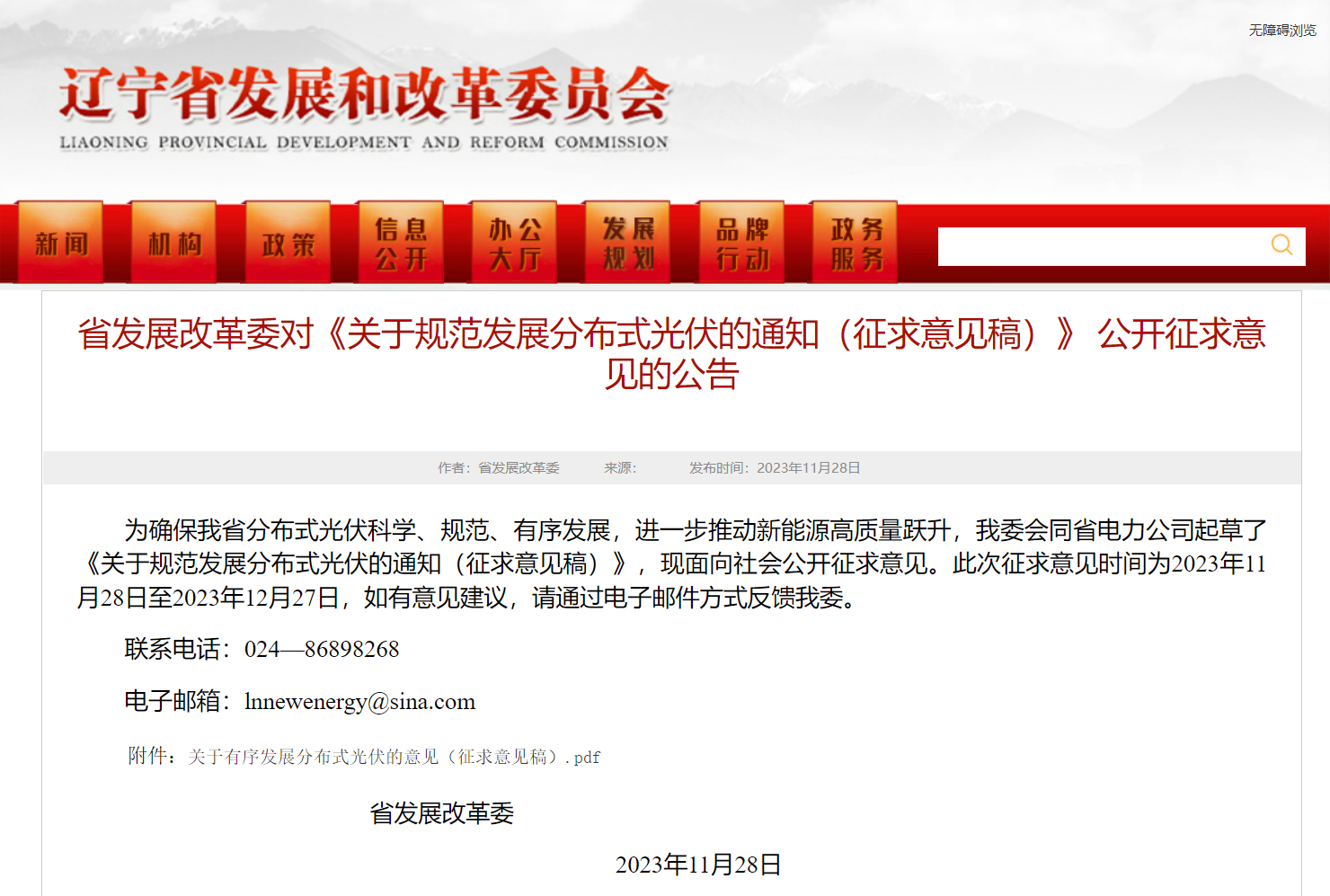 2023年11月28日,遼寧省發(fā)展改革委發(fā)布了關(guān)于規(guī)范發(fā)展分布式光伏的通知(征求意見稿)》 公開征求意見的公告。