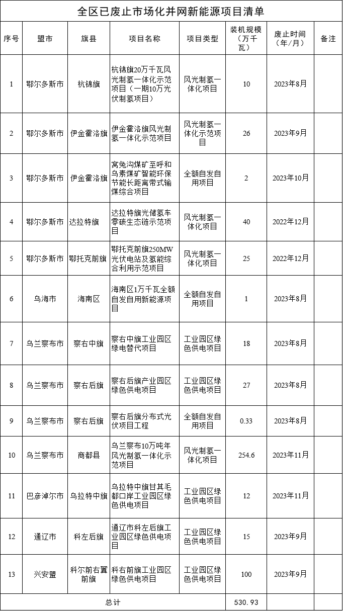 12月4日,內(nèi)蒙古自治區(qū)能源局對各盟市已廢止的市場化并網(wǎng)新能源項目進行了公告,合計13個項目,涉及裝機規(guī)模超530萬千瓦,項目清單如下: