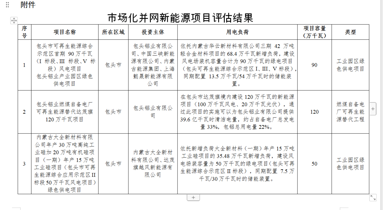 3個(gè)項(xiàng)目均納入市場化并網(wǎng)新能源項(xiàng)目清單,共配建新能源規(guī)模260萬千瓦,其中風(fēng)電240萬千瓦、光伏20萬千瓦。分別是:包頭鋁業(yè)有限公司、中國三峽新能源有限公司、內(nèi)蒙古能源集團(tuán)、上海懿晟新能源有限公司聯(lián)合投資的包頭鋁業(yè)產(chǎn)業(yè)園區(qū)綠色供電項(xiàng)目,項(xiàng)目容量90萬千瓦;2.包頭鋁業(yè)有限公司投資的包頭鋁業(yè)燃煤自備電廠可再生能源替代達(dá)茂旗120萬千瓦項(xiàng)目;3.內(nèi)蒙古大全新材料有限公司、達(dá)茂旗越風(fēng)新能源有限公司聯(lián)合投資的“內(nèi)蒙古大全新材料有限公司年產(chǎn)30萬噸高純工業(yè)硅加20萬噸有機(jī)硅項(xiàng)目(一期)年產(chǎn)15萬噸工業(yè)硅項(xiàng)目(包頭市可再生能源綜合應(yīng)用示范區(qū)II 標(biāo)段50萬千瓦風(fēng)電項(xiàng)目)綠色供電項(xiàng)目”。