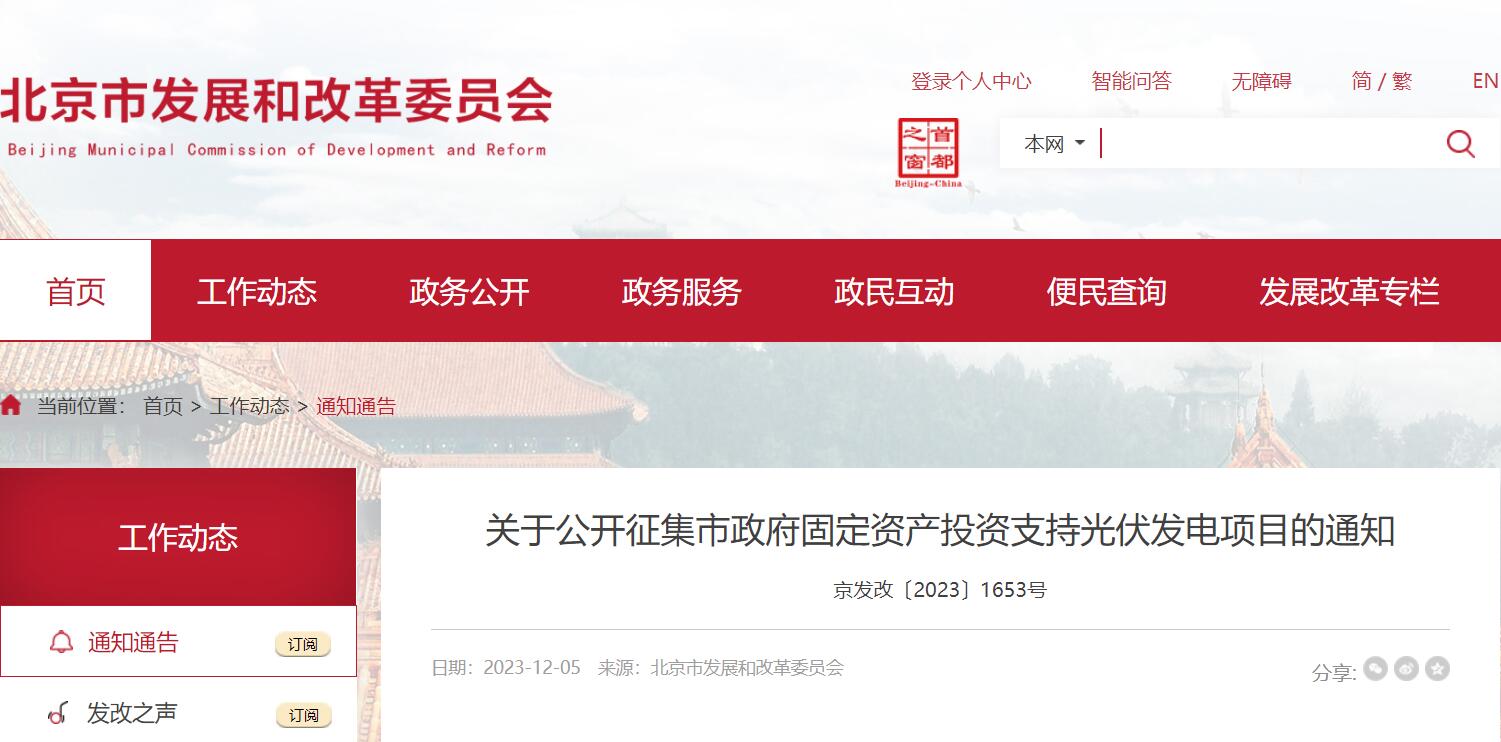 北京市發(fā)展和改革委員會關于公開征集市政府固定資產(chǎn)投資支持光伏發(fā)電項目的通知