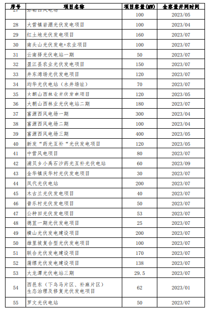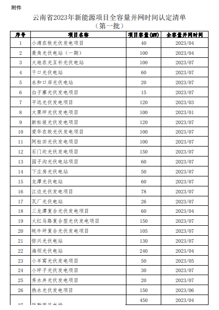 根據(jù)《云南省發(fā)展和改革委員會 云南省能源局關(guān)于云南省光伏發(fā)電上網(wǎng)電價政策有關(guān)事項的通知》(云發(fā)改價格〔2023〕319號)以及《云南省發(fā)展和改革委員會 云南省能源局關(guān)于進一步完善風(fēng)電上網(wǎng)電價政策有關(guān)事項的通知》(云發(fā)改價格〔2023〕665號)文件精神,新能源全容量并網(wǎng)時間的認(rèn)定由省能源局會同云南電網(wǎng)公司負責(zé)。為加強社會監(jiān)督,廣泛征求意見,現(xiàn)將經(jīng)認(rèn)定后的項目清單予以公示,有關(guān)情況如下: