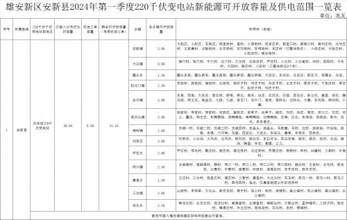 根據(jù)《雄安新區(qū)安新縣2024年第一季度220千伏變電站新能源可開(kāi)放容量及供電范圍一覽表》,安新縣13個(gè)鄉(xiāng)鎮(zhèn)2024年第一季度可開(kāi)放容量為31.18兆瓦。