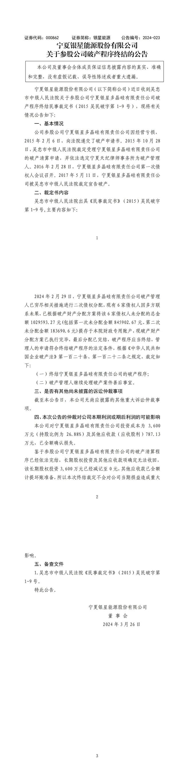 公司參股公司寧夏銀星多晶硅有限責(zé)任公司因經(jīng)營虧損,2015年2月6日,向法院遞交了破產(chǎn)申請書。2015年10月28日,吳忠市中級人民法院裁定受理寧夏銀星多晶硅有限責(zé)任公司的破產(chǎn)清算申請,并依法選定寧夏天紀律師事務(wù)所為破產(chǎn)管理人。2016年2月28日,寧夏銀星多晶硅有限責(zé)任公司第一次債權(quán)人會議召開。2017年5月11日,寧夏銀星多晶硅有限責(zé)任公司被吳忠市中級人民法院裁定宣告破產(chǎn)。2024年2月29日,吳忠市中級人民法院裁定如下:終結(jié)寧夏銀星多晶硅有限責(zé)任公司的破產(chǎn)程序,破產(chǎn)管理人繼續(xù)處理破產(chǎn)案件善后事宜。