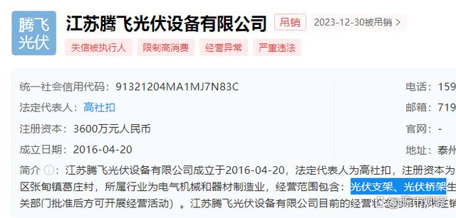 公開資料顯示,江蘇騰飛光伏設(shè)備有限公司于2016年注冊成立,距今已有8年時(shí)間。騰飛光伏主營業(yè)務(wù)為生產(chǎn)光伏組件,其中包括光伏支架、光伏橋架等產(chǎn)品的生產(chǎn)和銷售。有接近騰飛光伏的知情人士表示,騰飛光伏并非名不見經(jīng)傳的小工廠,而是曾位列全球出貨量前十的光伏組件工廠,2022年,騰飛光伏年產(chǎn)能高達(dá)20GW,生產(chǎn)的光伏組件熱銷歐洲、美洲、東南亞等。