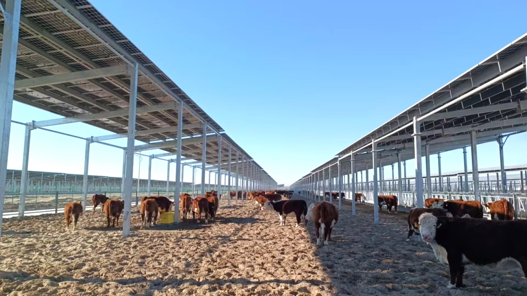 項(xiàng)目分三期建設(shè),一期占地9380畝,建設(shè)內(nèi)容包括育肥牛欄、動(dòng)物保健中心、全混合日糧中心、升壓站及送出線路等設(shè)施。其中,育肥牛欄建設(shè)面積達(dá)150萬平方米,建成后,養(yǎng)殖規(guī)模可達(dá)存欄肉牛10萬頭、年出欄肉牛20萬頭,將成為亞洲最大的牧光融合產(chǎn)業(yè)集群。超級(jí)牧場(chǎng)內(nèi)育肥牛舍屋頂光伏及草光互補(bǔ)區(qū)地面光伏兩部分組成,光伏總裝機(jī)容量398兆瓦。