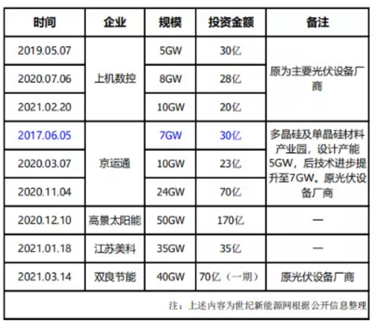 縱觀近幾年光伏行業(yè),擴產(chǎn)兇猛。如三一集團一樣跨界進入硅片行業(yè)的企業(yè)并不少。據(jù)世紀新能源網(wǎng)不完全統(tǒng)計,近兩年“跨界”或者突入、發(fā)力硅片板塊的企業(yè)并不少,較具代表性的主要為五家,分別為上機數(shù)控、京運通、雙良節(jié)能、高晶太陽能、美科,僅此五家,所涉及的硅片產(chǎn)能超180GW,總投超440億。