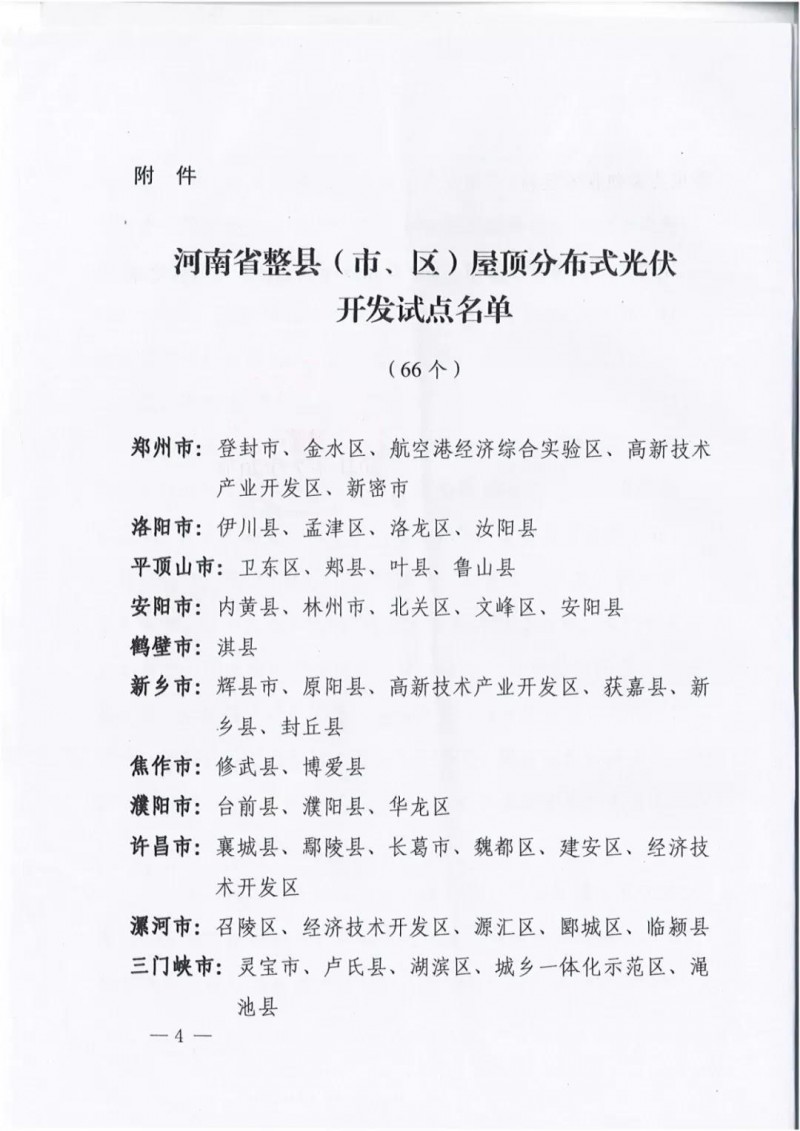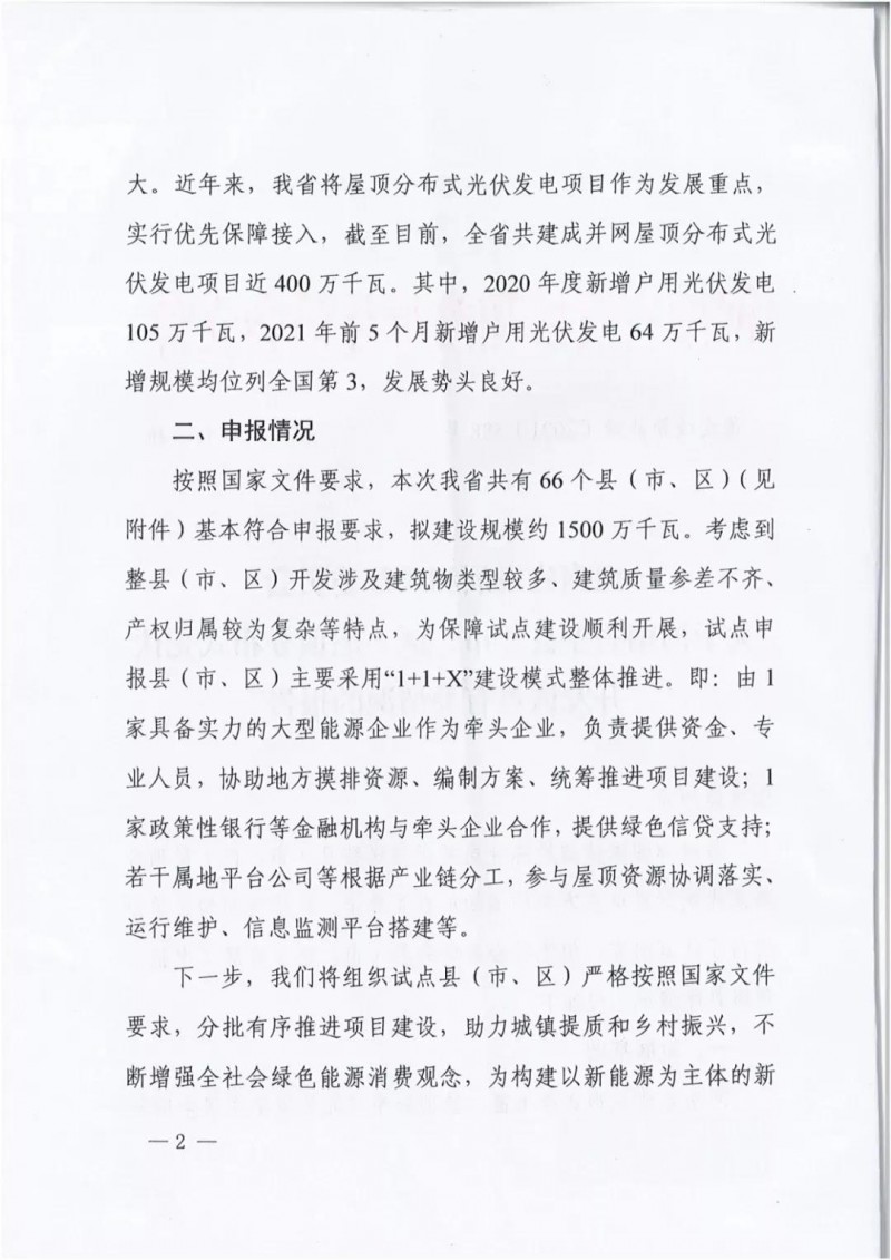 近日,河南發(fā)改委下發(fā)關(guān)于《關(guān)于河南省整縣(市、區(qū))屋頂分布式光伏開(kāi)發(fā)試點(diǎn)有關(guān)情況的報(bào)告》,文件顯示,河南省共有66個(gè)省(市、區(qū))基本符合申報(bào)要求,擬建設(shè)規(guī)模約1500萬(wàn)千瓦。文件指出,考慮到整縣(市、區(qū))開(kāi)發(fā)涉及建筑物類型較多、建筑質(zhì)量參差不齊、產(chǎn)權(quán)歸屬較為復(fù)雜等特點(diǎn),為保障試點(diǎn)建設(shè)順利開(kāi)展,試點(diǎn)申報(bào)縣(市、區(qū))主要采用“1+1+X”建設(shè)模式整體推進(jìn)。